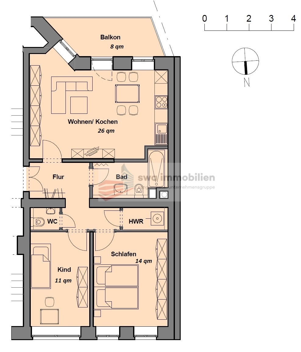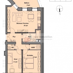 - drei Wohnräume mit 26 qm, 14 qm und ca. 11 qm Wohnflächen