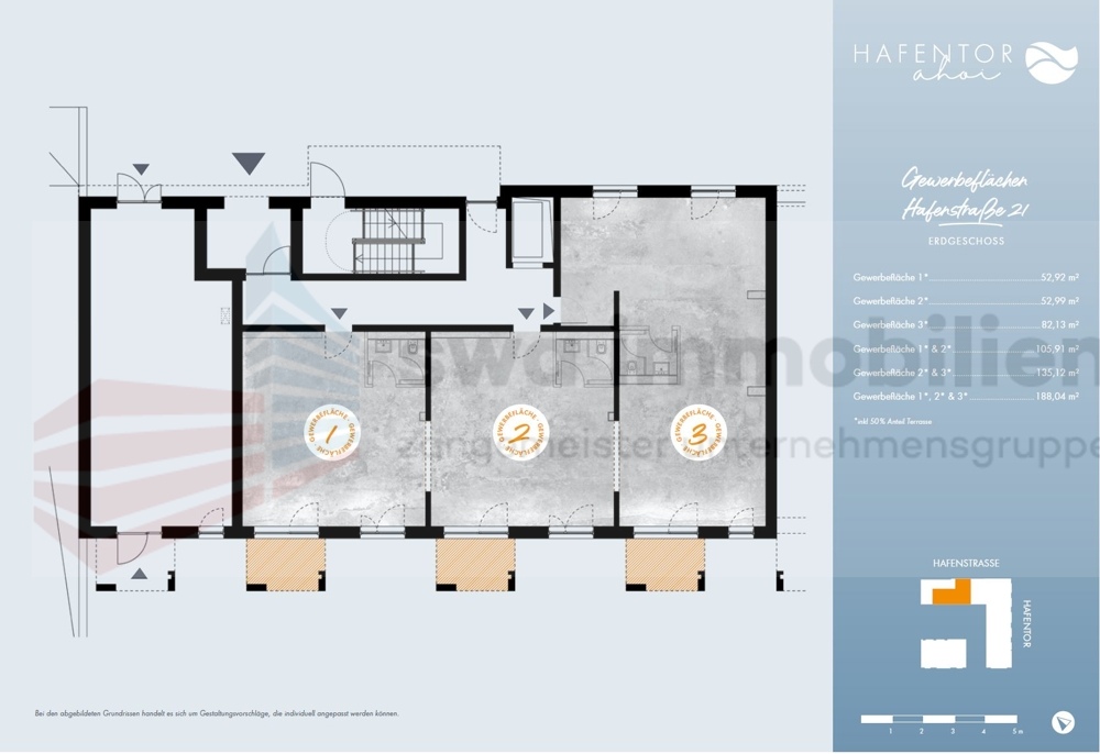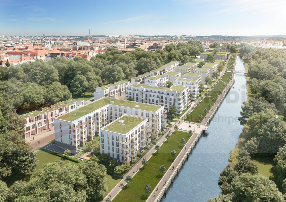 Im Westen von Leipzig am Lindenauer Hafen entstehen bis zum Frühjahr 2020 moderne Gewerbeflächen für eine Gemeinschaftspraxis, Büros oder eine Kanzlei direkt am Wasser. Das Erdgeschoss ist für die Vermietung flexibler Gewerbeeinheiten vorgesehen, die variabel von 53m² bis 188m² gestaltet werden können.Das Gebäude befindet sich derzeit im Bau. Dadurch können individuelle Einrichtungen und Größen der Gewerbeflächen noch vereinbart werden.Die Planung sieht für die Vermietung verschiedene mögliche Varianten vor.Einzelbüros mit jeweils 53 oder 82m². Durch das Zusammenlegen der beide kleinen Büros würde eine Fläche von 106m² entstehen oder alternativ von 135m² wenn man eins der kleinen mit dem mittleren Büro zusammenlegt.Möglich ist auch die Anmietung der Gesamtfläche mit ca. 188m².Ausstattung